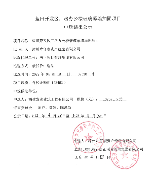 中選結(jié)果公示--藍(lán)田開發(fā)區(qū)廠房辦公樓玻璃幕墻加固項目