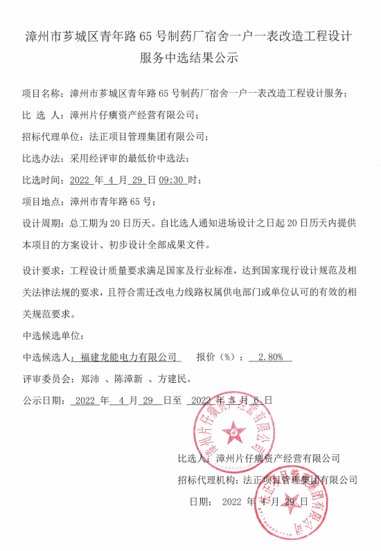 漳州市薌城區(qū)青年路65號(hào)制藥廠宿舍一戶一表改造工程設(shè)計(jì)服務(wù)中選結(jié)果公示